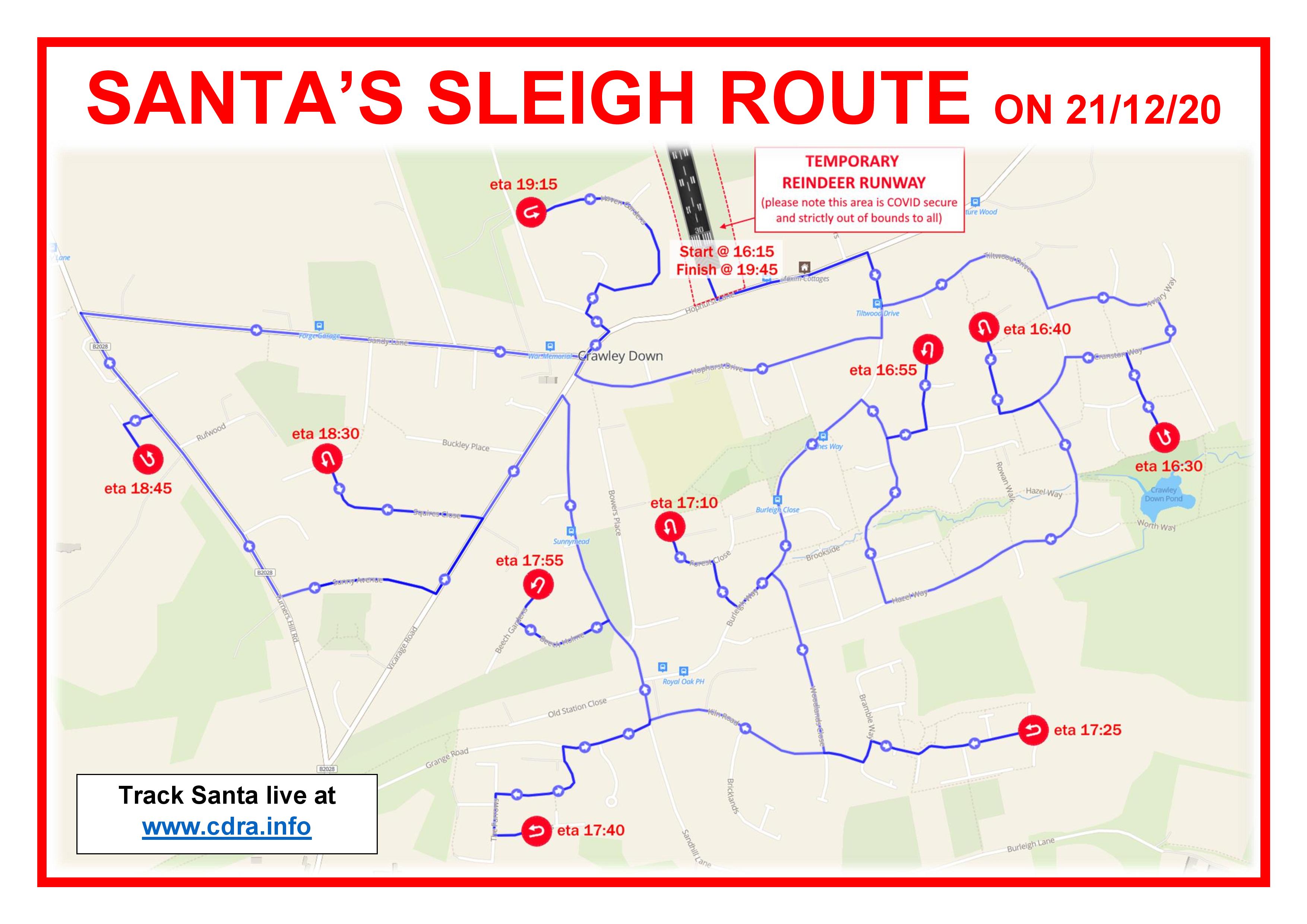 Starting at 4:15pm on 21st December he will be taking his sleigh around our village and is looking forward to seeing all the good children (and grownups!) of Crawley Down.